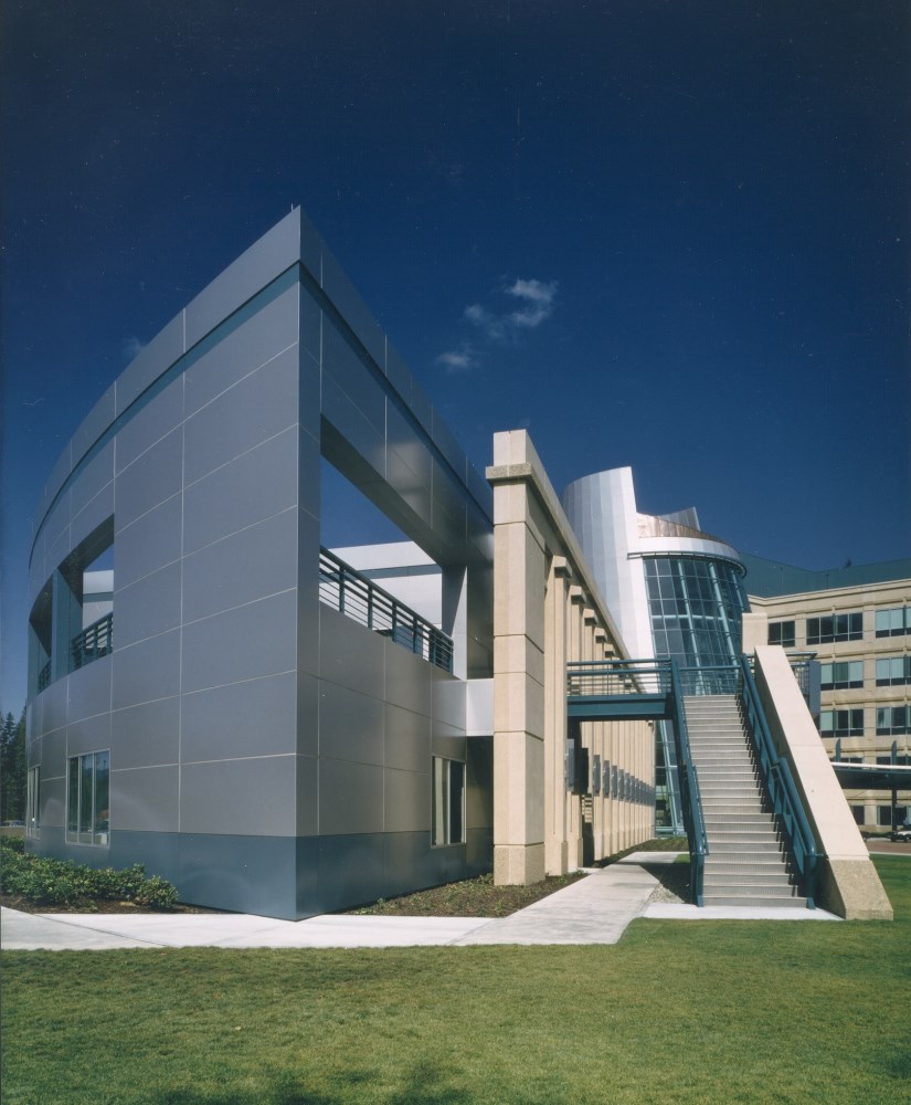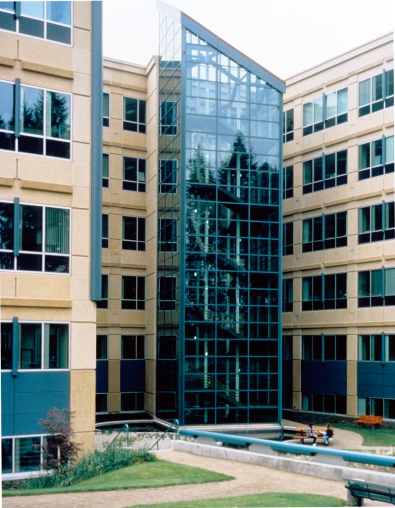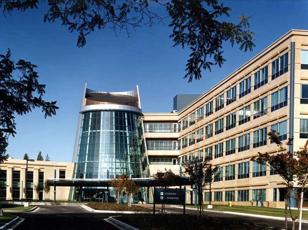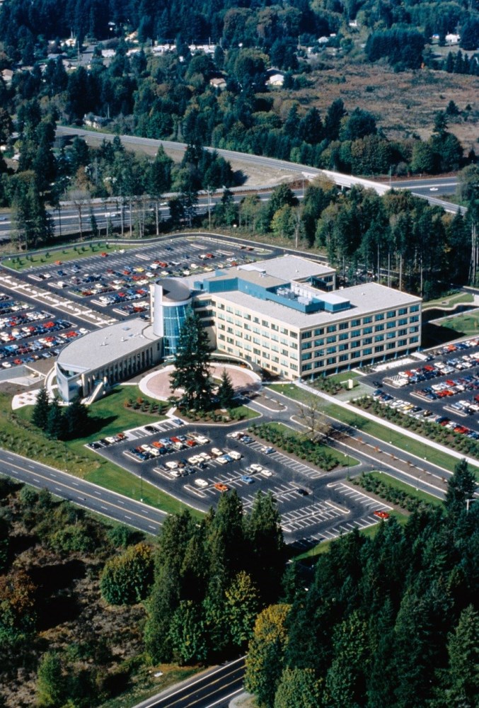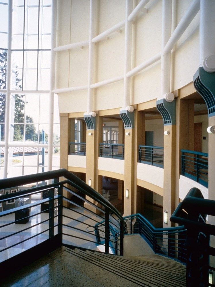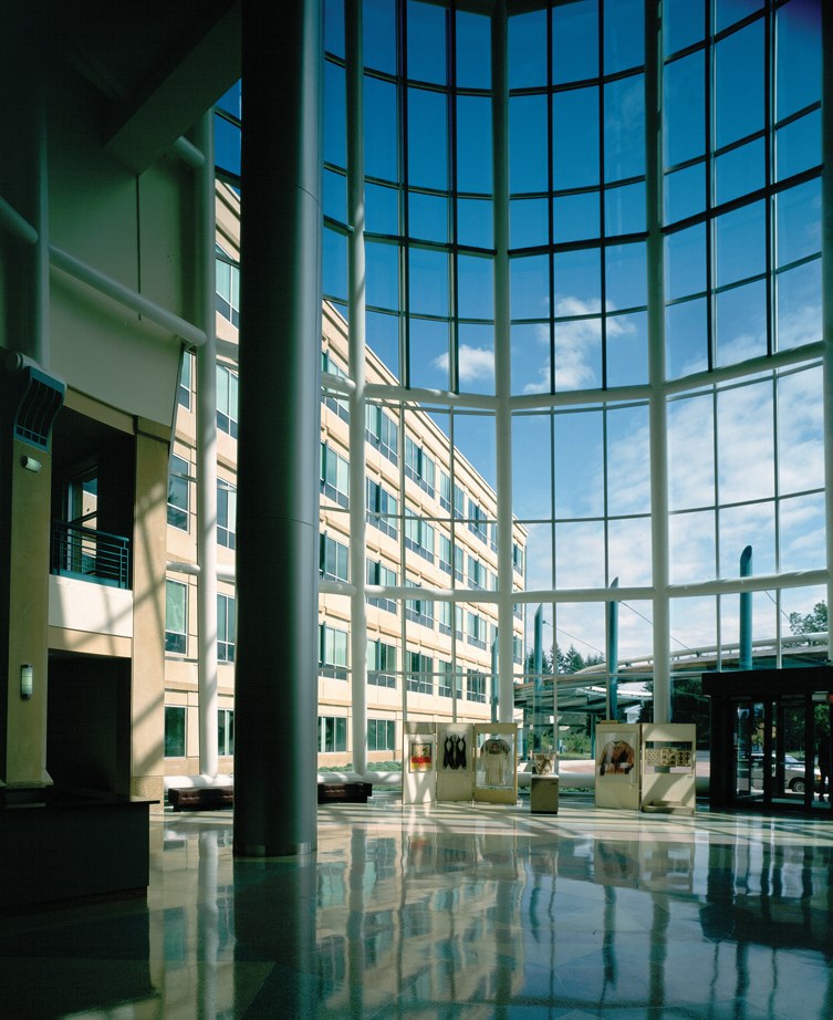 This new state office building is situated on a heavily wooded 35-acre site just south of Olympia, Washington. Consistent with the natural surroundings, it was also designed as a breakthrough "healthy" building meeting Washington's new air quality and environmental safety standards. The design joins a 410,000 sf five story office building and a smaller dining/conference pavilion with a grand rotunda which serves as the main entrance to the complex. This cone-shaped glass rotunda - reminiscent of an evergreen tree and framing a view of Mount Rainier - provides a warm welcome to visitors. The employee work and shared spaces are equally welcoming, functional - and healthy.