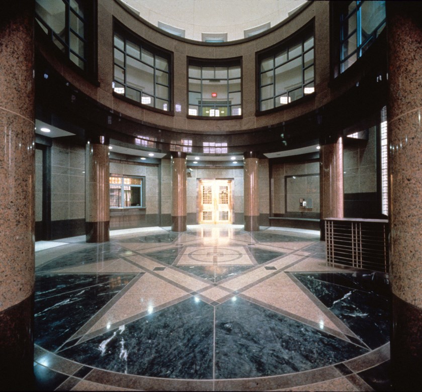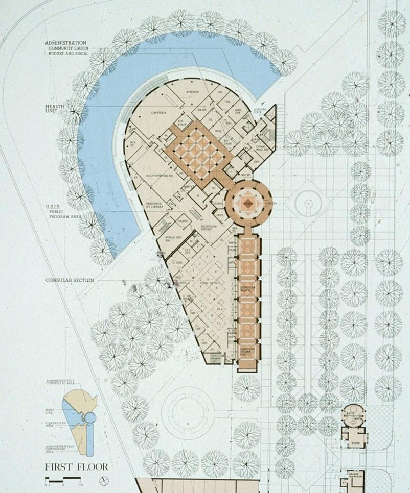 Located near downtown Santiago, this prominent 5-acre site chosen for the U.S. Embassy provided a considerable design challenge, but it offers magnificent views of snow-covered mountains, the river and the downtown skyline. Prevailing seismic conditions and security requirements added to the challenge. Public and private functions are separated: the Consular and USIS sections occupy their own two story building, while Embassy offices are housed in a five story circular tower. A formal entry rotunda and service tower joins these two components. The end result is a structure that stands as a dynamic symbol of the United States and yet is highly efficient and functional.
