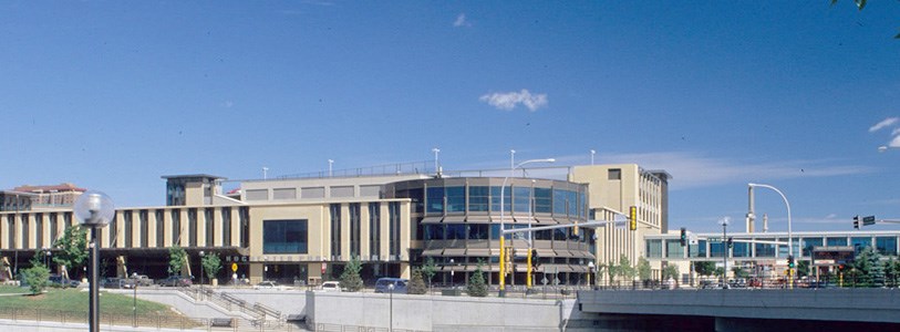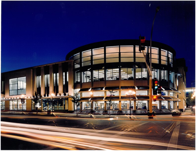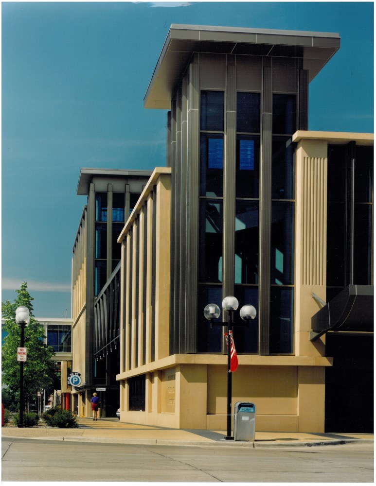 This library is a distinctive and contemporary addition to the center of downtown Rochester, Minnesota, home to the Mayo Clinic. A graceful, glass-enclosed rotunda creates a unique identity and focal point, and also provides appealing river views and a sunny southern exposure. Inside, the library incorporates advanced technology that impacts everything from customer services and materials handling to communications and information systems. Enclosed ramps (skyways) link the library to its adjacent parking ramp and the Mayo Civic Center.