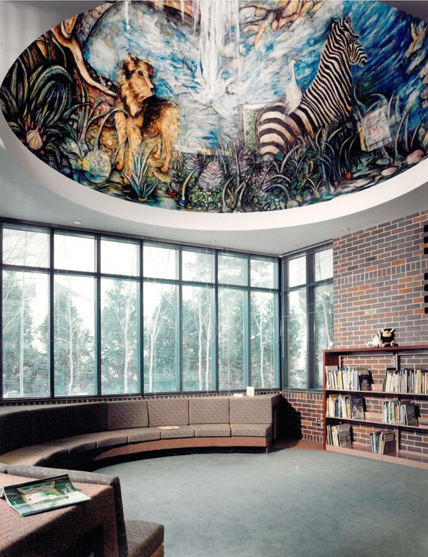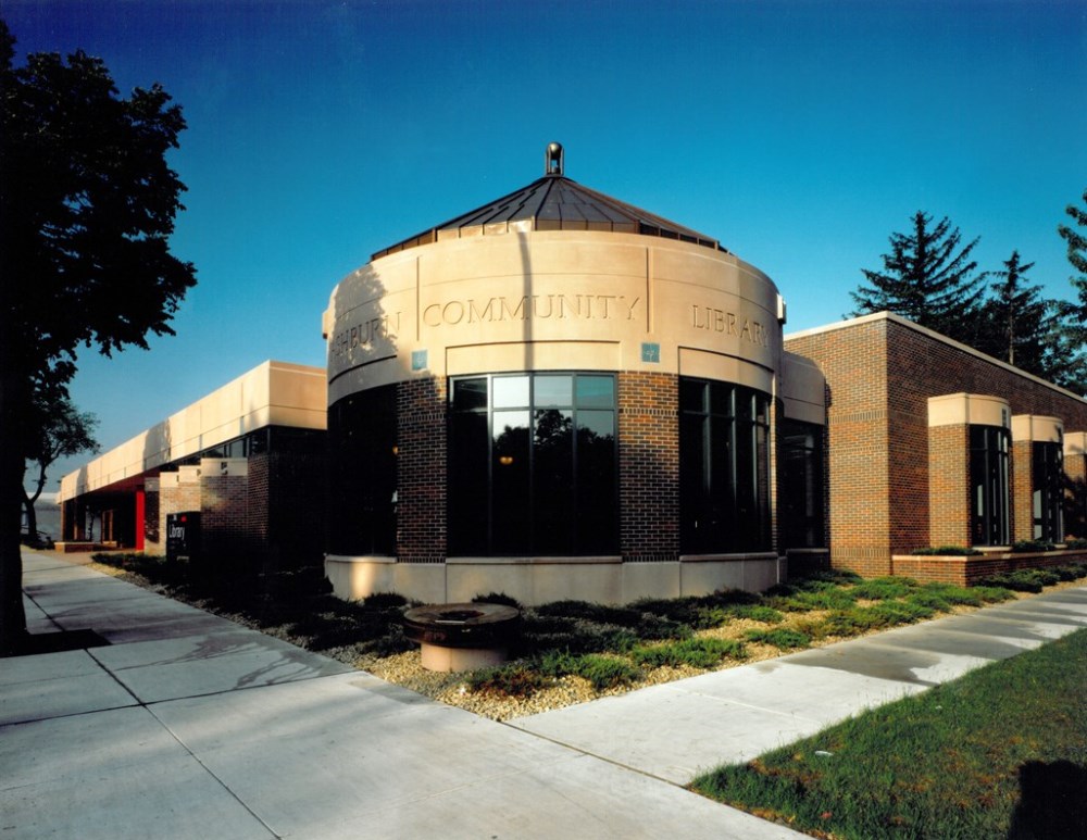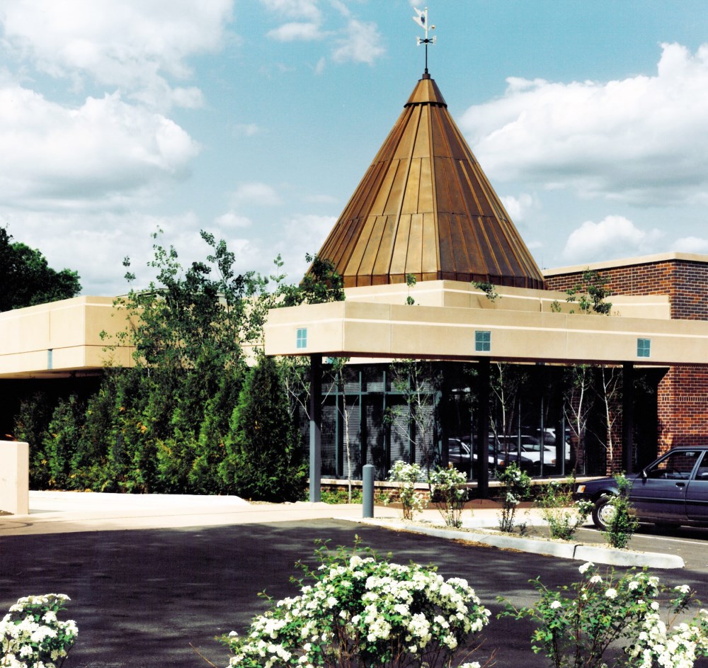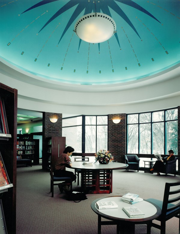 This popular community library, originally opened in 1969, needed significant expansion and upgrading. The new plan doubled the library's capacity while improving lighting and environmental systems. Stacks were expanded within the existing space, while new reading areas were created in the addition, at opposite corners of the building. The main room offers unobstructed views of Minnehaha Parkway, while the smaller tower of the children's picture book reading room, referred to as the "witch's hat", is playfully topped with a spinning weather vane.