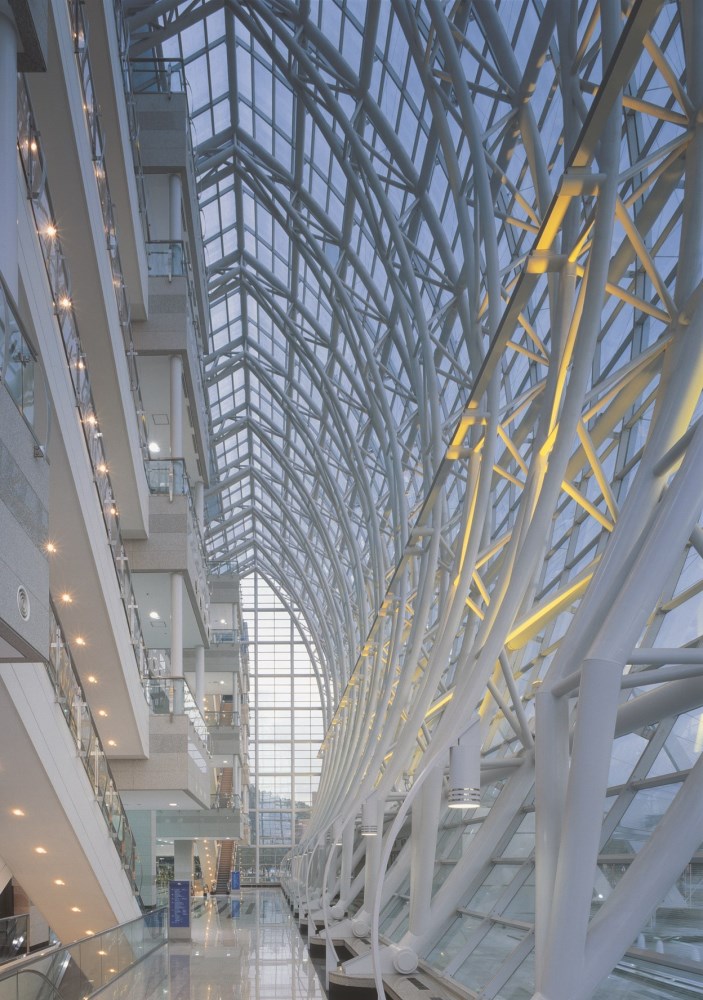Part of an enormous redevelopment project in the center of the city of Daegu, the Trade and Exhibition Center features a "stacked" design that maximizes the use of available land. There are three levels of flexible exhibition space, two levels of permanent sales and meeting space, and three levels of underground parking. This represents over 170,000 SF of exhibition space with high ceiling clearances, 14 freight docks, two truck elevators, and room for 700 cars. In addition, the commercial traffic flow and public access are completely segregated to ensure smooth operations and changeovers. All of this function is fit into a beautiful and dramatic form.
