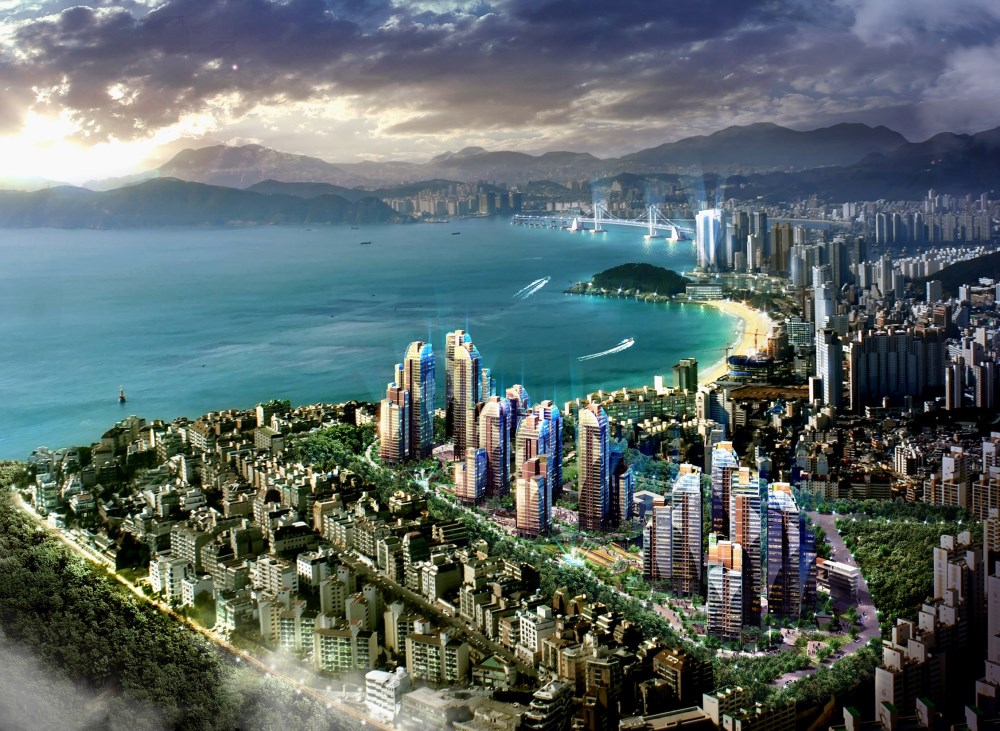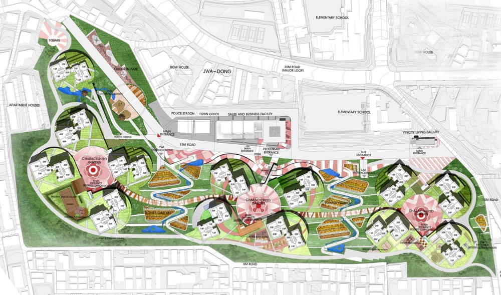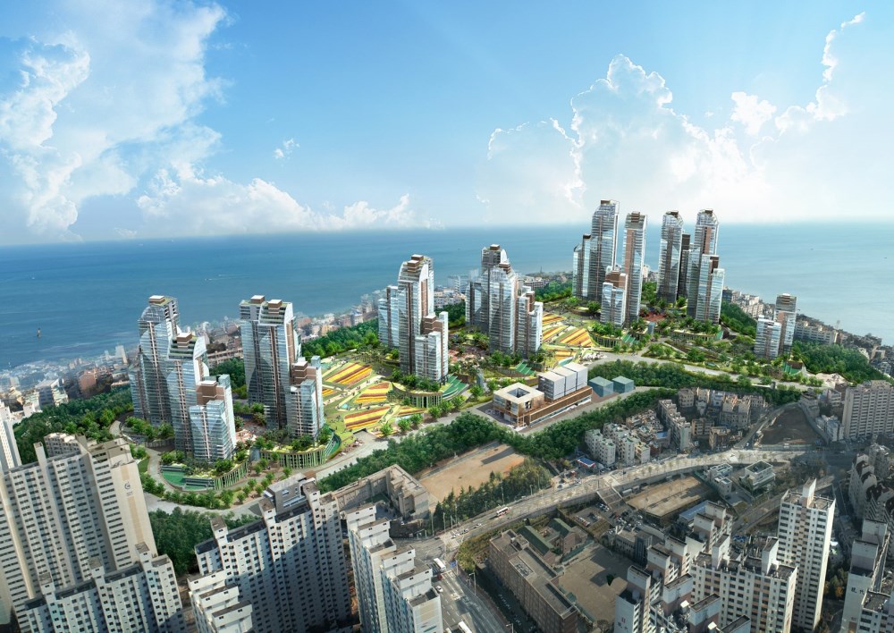 This apartment complex is located in a most desirable and breathtaking setting in the eastern part of Busan. With this location, an essential design objective was to provide maximum, unrestricted views for each resident. The result is three separate tower groups - each of them more like a small village. They are all connected to each other in a seemingly natural way within the beautifully designed and landscaped grounds. Yet each one also stands alone, possessing its own unique character, and with its own courtyard, playgrounds, gardens and picnic areas.