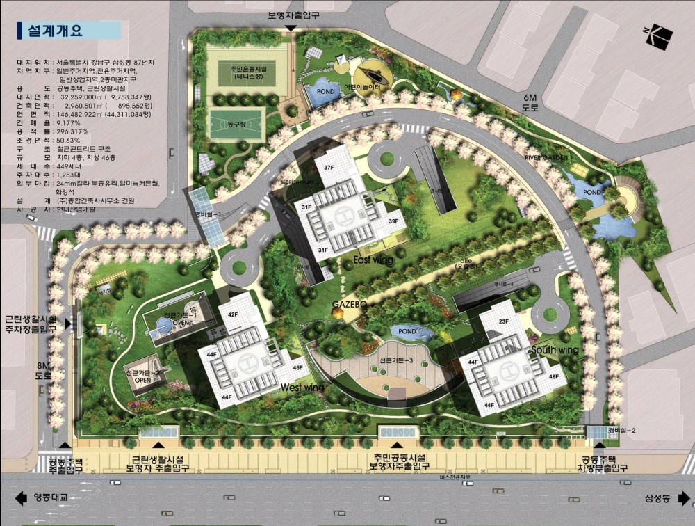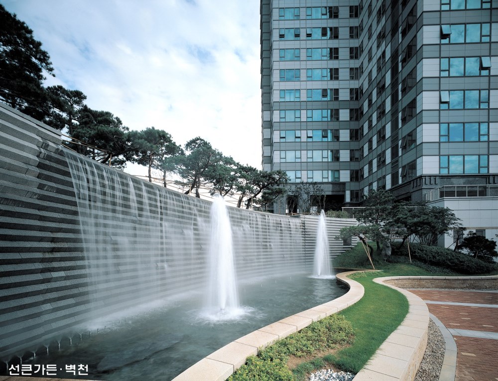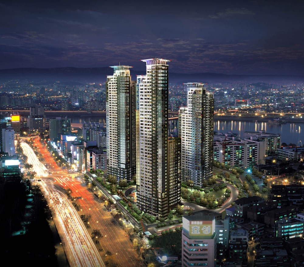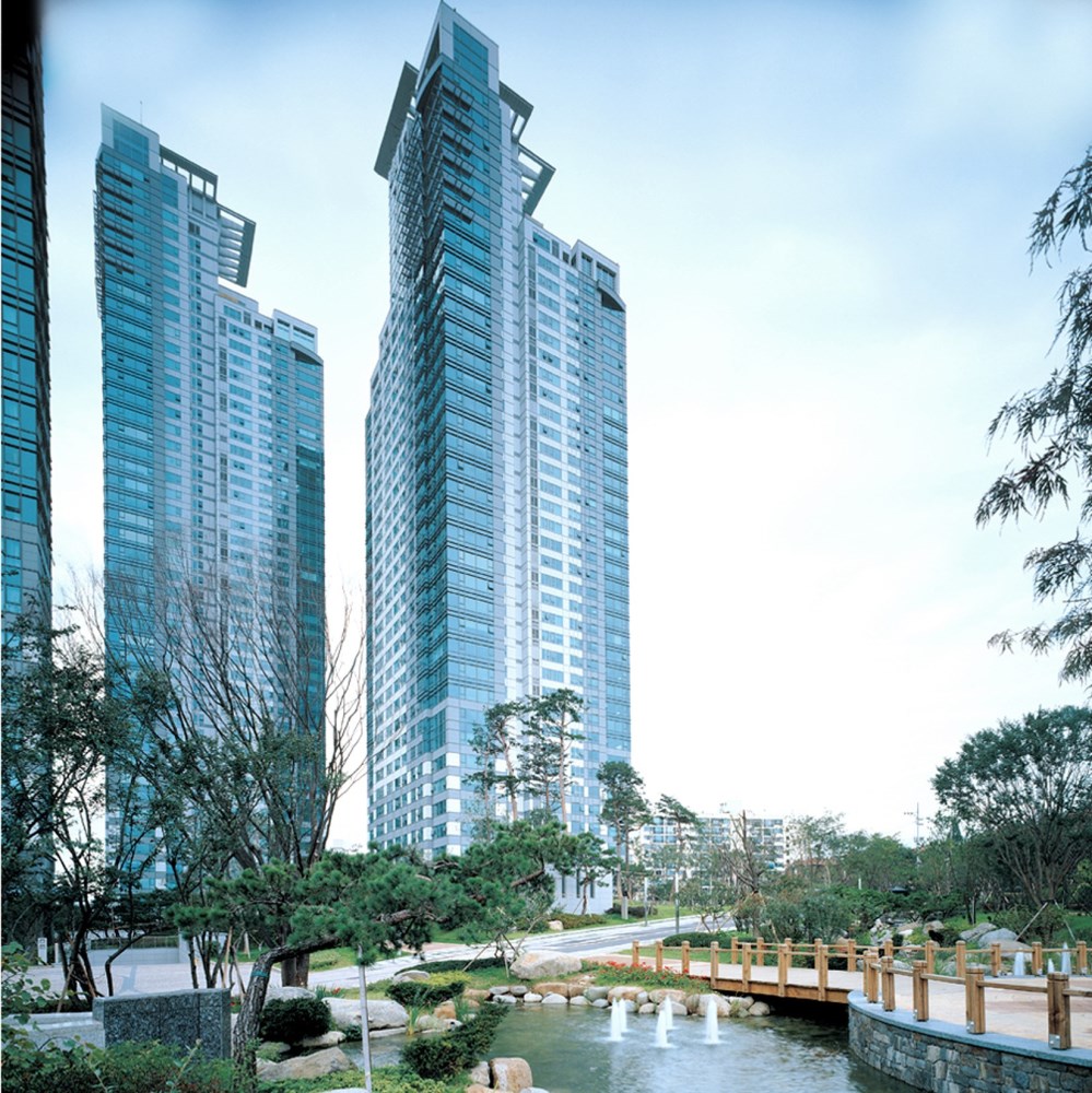 The tallest housing complex in Seoul, Trinity Towers consists of three 46-story buildings containing 350 luxury units (1.5 million SF). Taking advantage of the site's interesting topography, Trinity Towers features an extensive network of trails, plazas, trees and other amenities. Natural light streams in even on the lower levels. The complex itself boasts a health club, retail shops and underground parking. All of this has made Trinity Towers a calm and welcome retreat in the very heart of this bustling city.