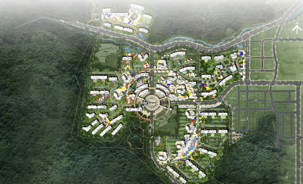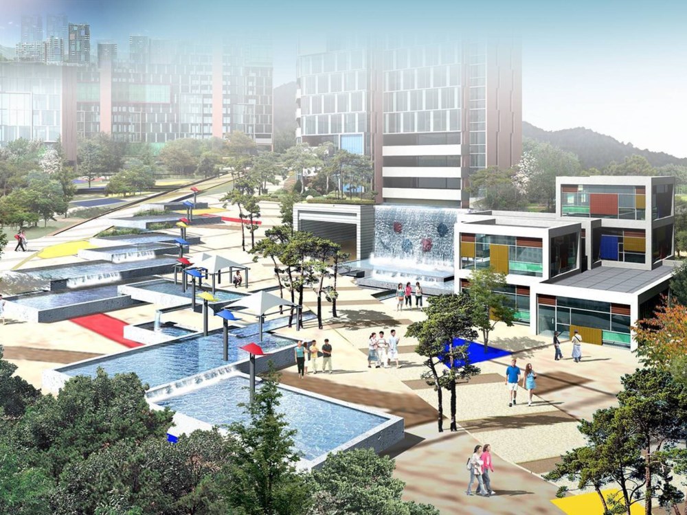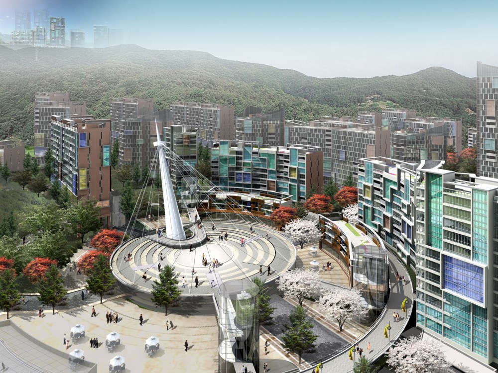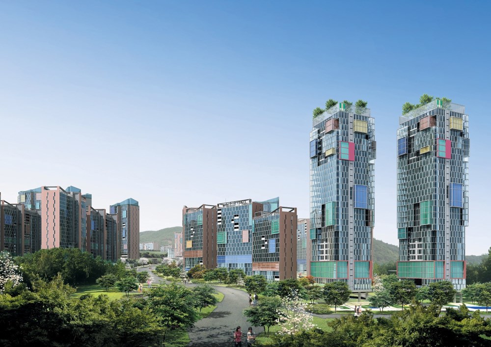 This urban housing project in Yongin, South Korea is situated along the Sonbok River. Incorporating natural elements, it seeks through its design to harmoniously blend people and technology with nature. Mondrian Town is a large community with over 10,000 residents in 3,000 apartments. The village center, centrally located and easily accessible, provides residents with a variety of shops, library, daycare, post office, and other services that create a sense of community.