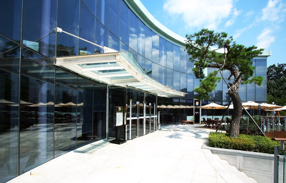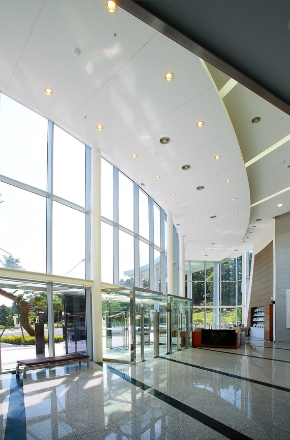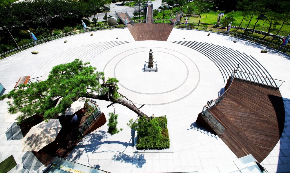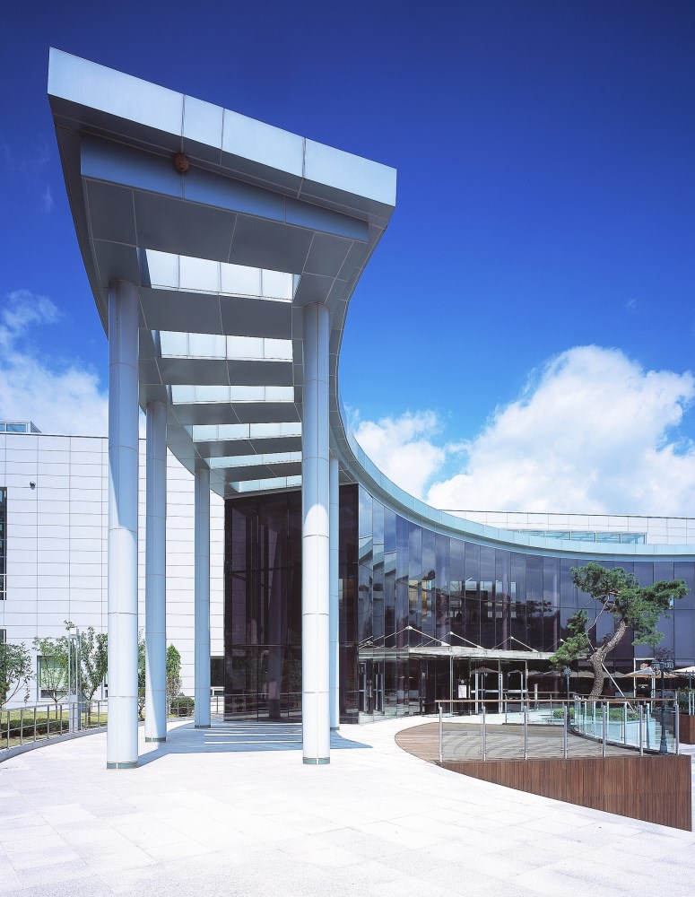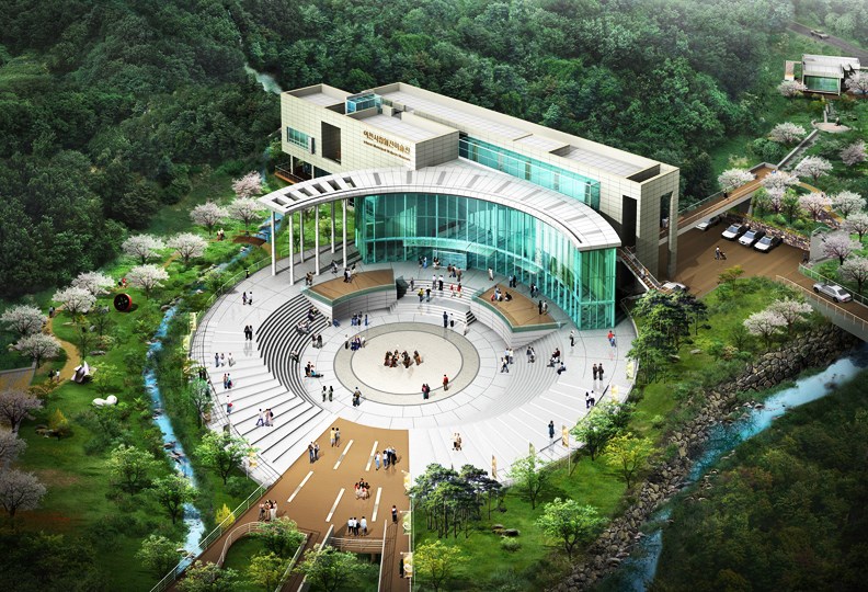 Situated in the midst of a beautiful natural setting, this museum achieves a harmonious balance between nature and architecture, the Yang of the building and the Yin of the outdoors. It is representative of Korean philosophy, and provides an ideal environment for the museum's cultural focus. The museum's location is within the cultural complex where pottery is manufactured, and is itself a center for displaying pottery and art. PDI won a design competition with this project. The artist, after whom the museum was named, was designated by his country as a human national treasure. One of his favorite subjects to paint was cranes. We worked the crane motif into the plaza shape. Woljeon is the artist's pen name, which means "moon in the rice field." The original concept was to have the center of the plaza filled with water so that if would reflect the moon at night. Visitors can enjoy the artist's paintings from the inside, and see the moon and crane motif through the glass windows looking to the outside.