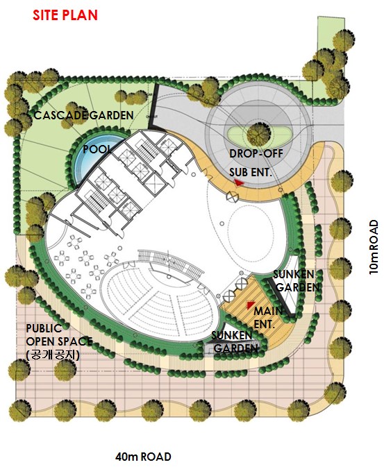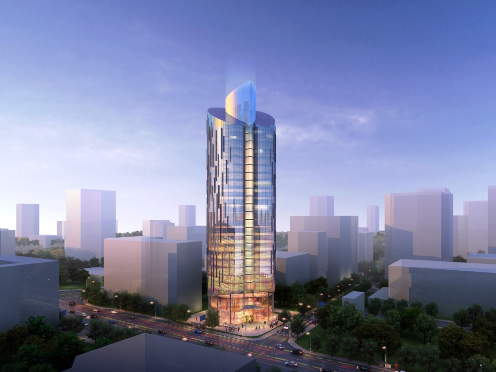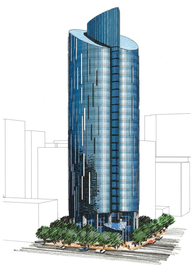 In this version, the tower halves are separated to reduce the massing of the building and emphasize each ellipse. This creates potential green break spaces located at every second or third floor and the cleft also introduces more natural daylight into the core of the building. The exterior is shown in blue reflective glass with vertical fins that are spaced to provide more shading on east and west faces and that create a distinctive aesthetic image. The building "emerges" from a shallow reflective pool that surrounds the lobby. Solar collectors cover the sloped roof.