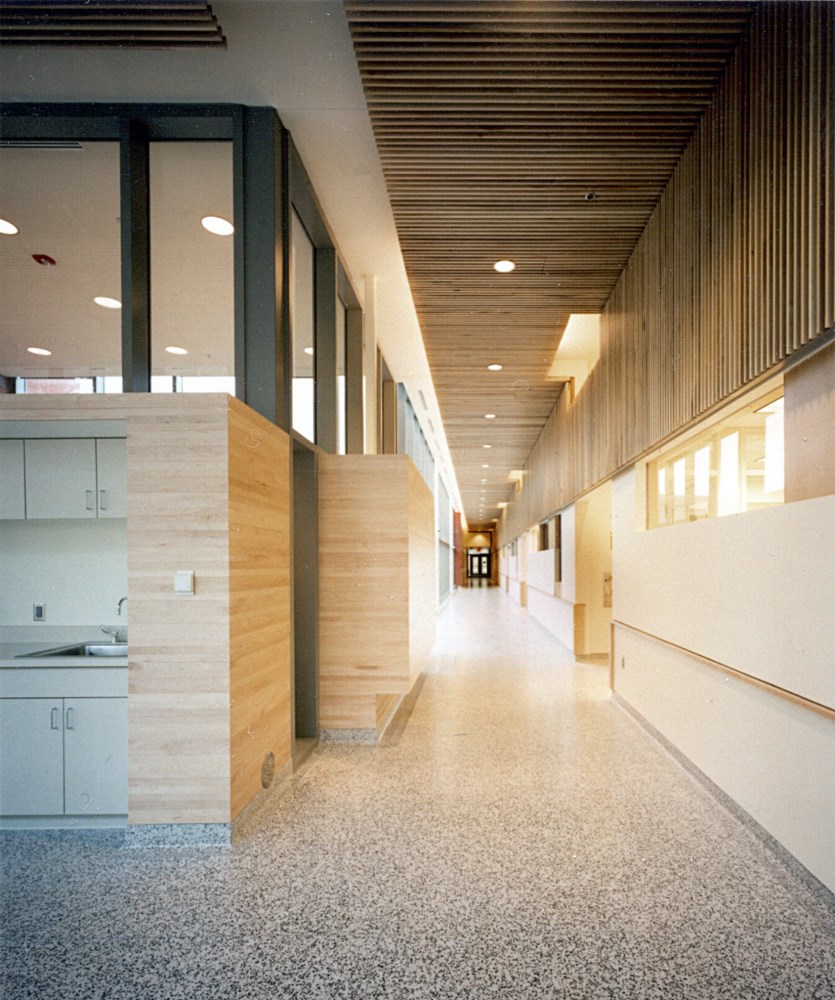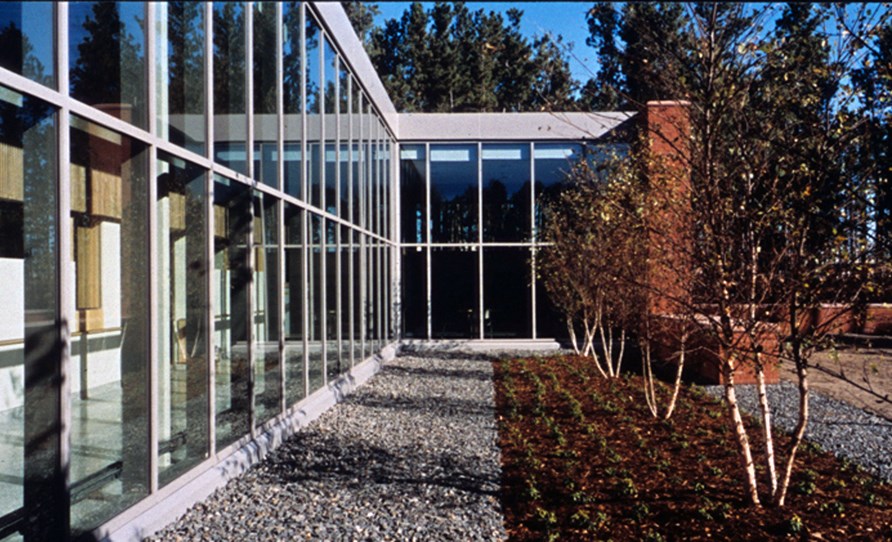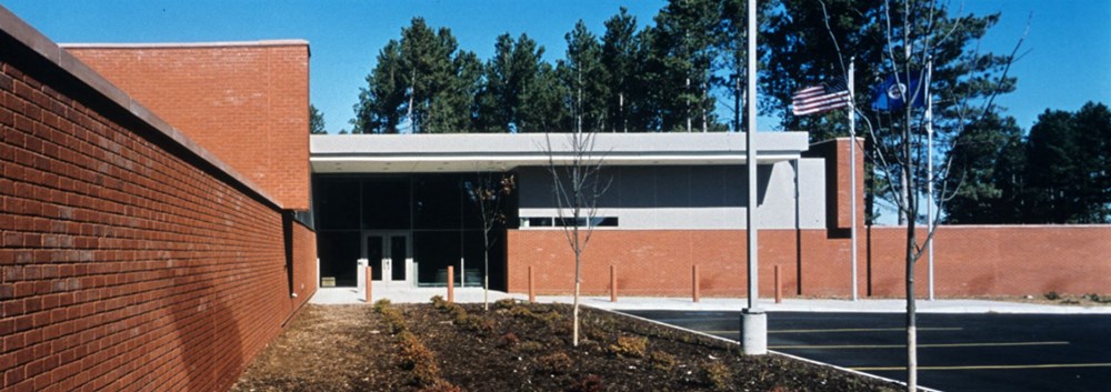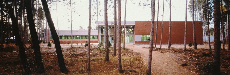 The Northern Services Center for the Bureau of Criminal Apprehension is located in Bemidji, Minnesota. A unique feature of this five-acre site is an existing grove of Red Pine trees covering the entire north half. Striving to minimize impact on the tree grove, the site plan organizes vehicle access and parking to the south and east adjacent to the approach roads while gently nestling the one-story building into the stand of tall evergreens. Interior building functions are organized along a major north-south circulation spine, named the Interaction Hall. The northern third of the hall is fully glazed to capture views into the Red Pine Grove.